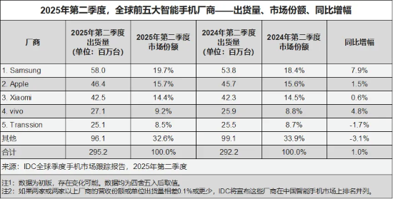据Canalys公布的2025年第二季度全球智能手机市场情况,